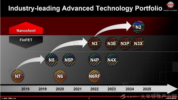 在臺(tái)積電2022年技術(shù)論壇上,臺(tái)積電公布了7nm至2nm先進(jìn)制程,以及包括射頻/連網(wǎng)性、CMOS影像感測(cè)、MEMS和電源管理在內(nèi)的特色工藝的現(xiàn)狀與規(guī)劃等。其中,2nm工藝將在2025年量產(chǎn)。