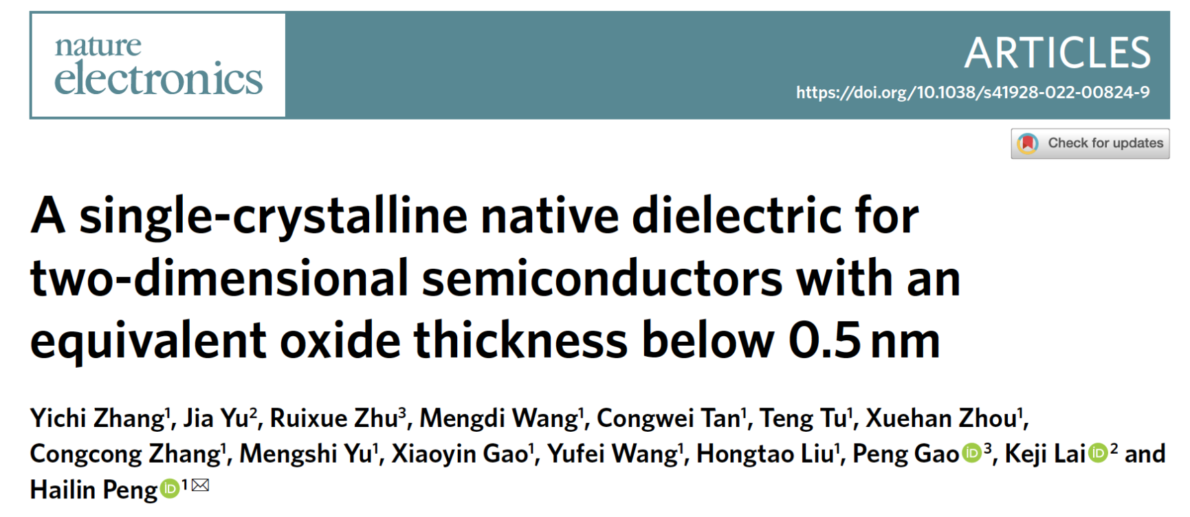 該研究成果于2022年9月15日在線(xiàn)發(fā)表在《自然-電子學(xué)》(Nature Electronics 2022, https://doi.org/10.1038/s41928-022-00824-9)。北京大學(xué)化學(xué)與分子工程學(xué)院彭海琳教授為該論文的通訊作者,第一作者為北京大學(xué)化學(xué)與分子工程學(xué)院博士研究生張亦弛。其他主要合作者還包括德州大學(xué)奧斯汀分校物理系賴(lài)柯吉教授、北京大學(xué)物理學(xué)院高鵬教授等。Nature Electronics期刊每期會(huì)挑選論文邀請(qǐng)作者撰寫(xiě)研究簡(jiǎn)介(Research Briefing),與研究論文同期在線(xiàn)刊出,方便讀者更好地理解重要成果。彭海琳教授和張亦弛同學(xué)代表論文作者發(fā)表了題為“Producing ultrathin monocrystalline native oxide dielectrics f2D transistors(為二維晶體管制備超薄單晶自然氧化物介電層)”的研究簡(jiǎn)介,簡(jiǎn)要介紹了此項(xiàng)研究的背景、過(guò)程、發(fā)現(xiàn)和意義。