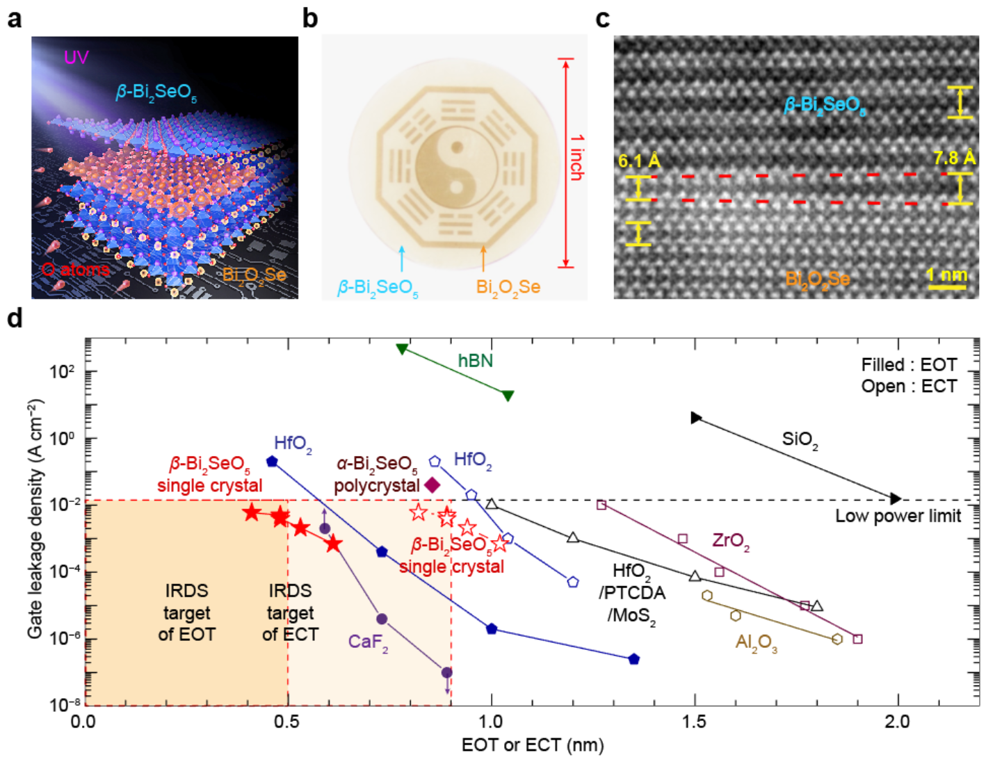 圖1.單晶自然氧化物柵介質(zhì)β-Bi2SeO5的制備與性質(zhì)。(a)二維Bi2O2Se紫外光輔助插層氧化轉(zhuǎn)化為單晶柵介質(zhì)β-Bi2SeO5示意圖;(b)晶圓級(jí)區(qū)域選擇性制備二維Bi2O2Se / Bi2SeO5異質(zhì)結(jié);(c)二維Bi2O2Se /Bi2SeO5異質(zhì)結(jié)界面結(jié)構(gòu);(d)β-Bi2SeO5的等效厚度(EOT:等效氧化層厚度;ECT:等效電容厚度)及絕緣性與其他柵介質(zhì)的對(duì)比。